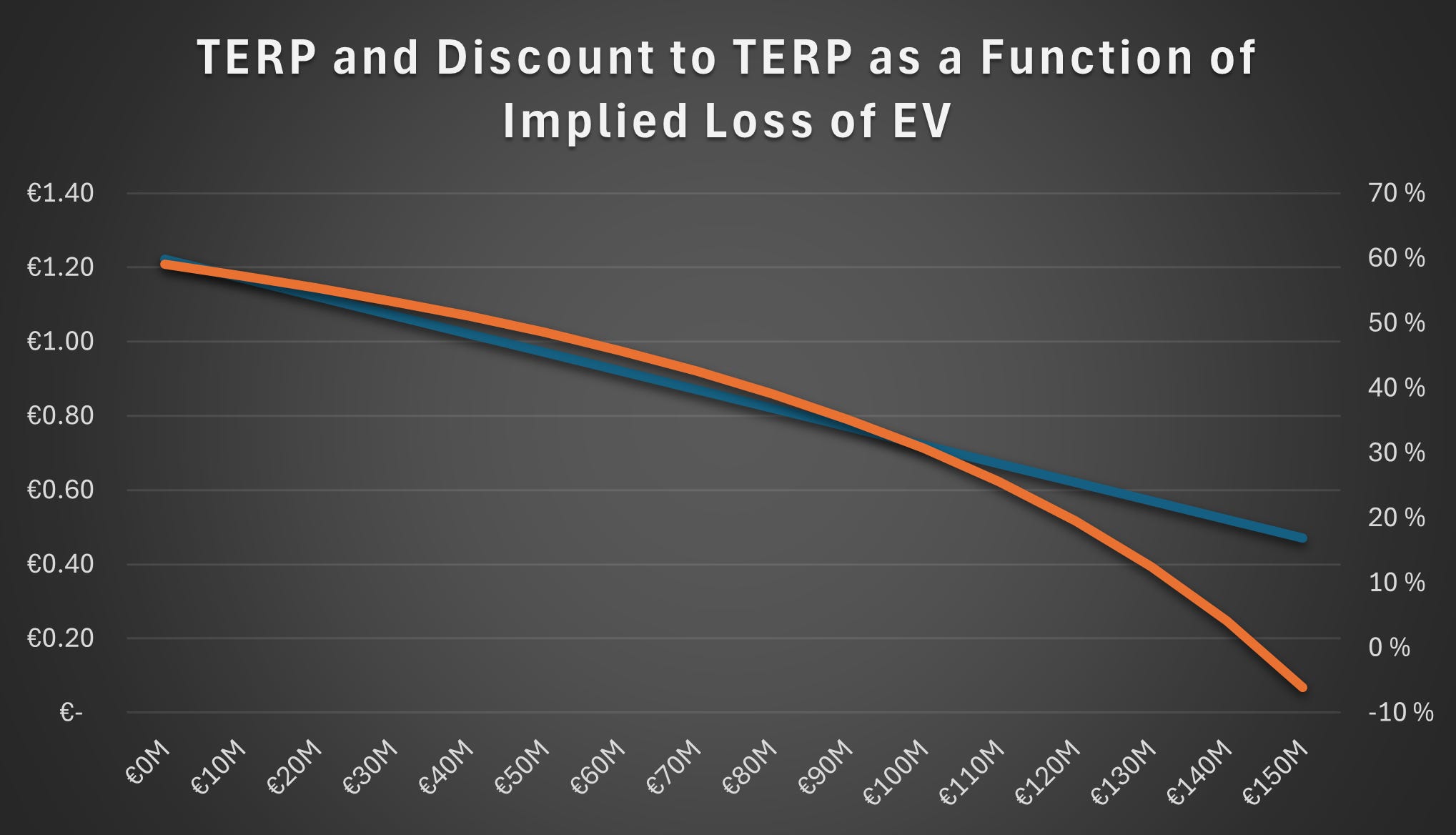 Figure 6 shows TERP and the discount to TERP on the right axis as a function of the implied loss in enterprise value (EV). If the implied loss is assumed to exceed €144 million, the offering would be priced at a premium to TERP.
