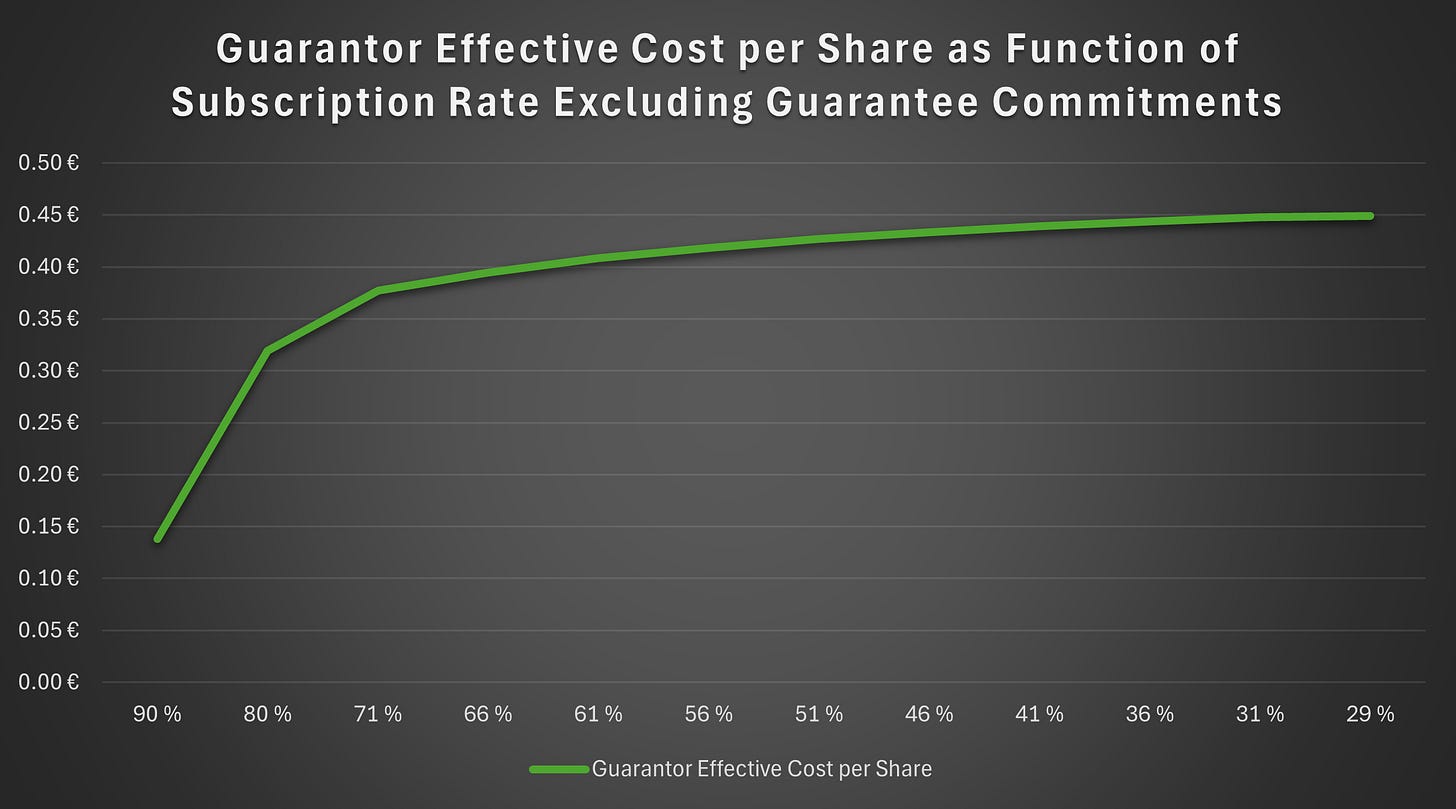 As shown in Figure 7, the effective cost to guarantors is materially below the actual subscription price. The horizontal axis shows the subscription rate excluding guarantee commitments. Accordingly, a subscription rate of 71% refers to a scenario in which 29% of the issue is allocated to guarantors, corresponding to an allocation worth approximately €12 million. In that case, the guarantors break even provided that they are able to divest the shares at a price of €0.39 or above. If the subscription rate exceeds 71%, the effective price declines rapidly, although the actual allocation to guarantors also decreases. At the other end of the range, 29% refers to a situation in which no subscriptions are made beyond the subscription commitments and anchor commitments.