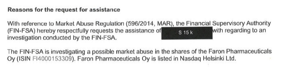 Faron has been involved in two FIN-FSA cases, both of which appear to remain ongoing. The first is an investigation concerning possible market abuse in Faron’s shares. The suspected conduct appears to be connected to the public share issue carried out in 2024.