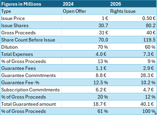The key parameters of the two offerings are set out below. Guarantee commitments are fee-based commitments, typically provided by external investors. Subscription commitments are unpaid commitments and are typically provided by existing shareholders. In addition to the guarantee and subscription commitments listed below for the 2026 Rights Issue, the transaction also includes cornerstone investments amounting to €4.7 million.